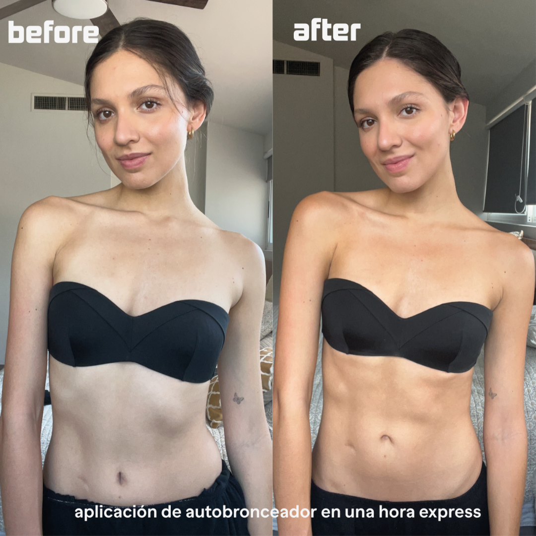 (2) Después de bañarte, ¡ya no manchas! El tinte guía se eliminará por completo y tu piel mostrará un color inicial ligero, que se intensificará en las siguientes 8 horas. Usa nuestro guante de gamuza para lograr un bronceado uniforme y perfecto. El tono dura de 5 a 7 días, dependiendo de la exposición al agua y la fricción en la piel.