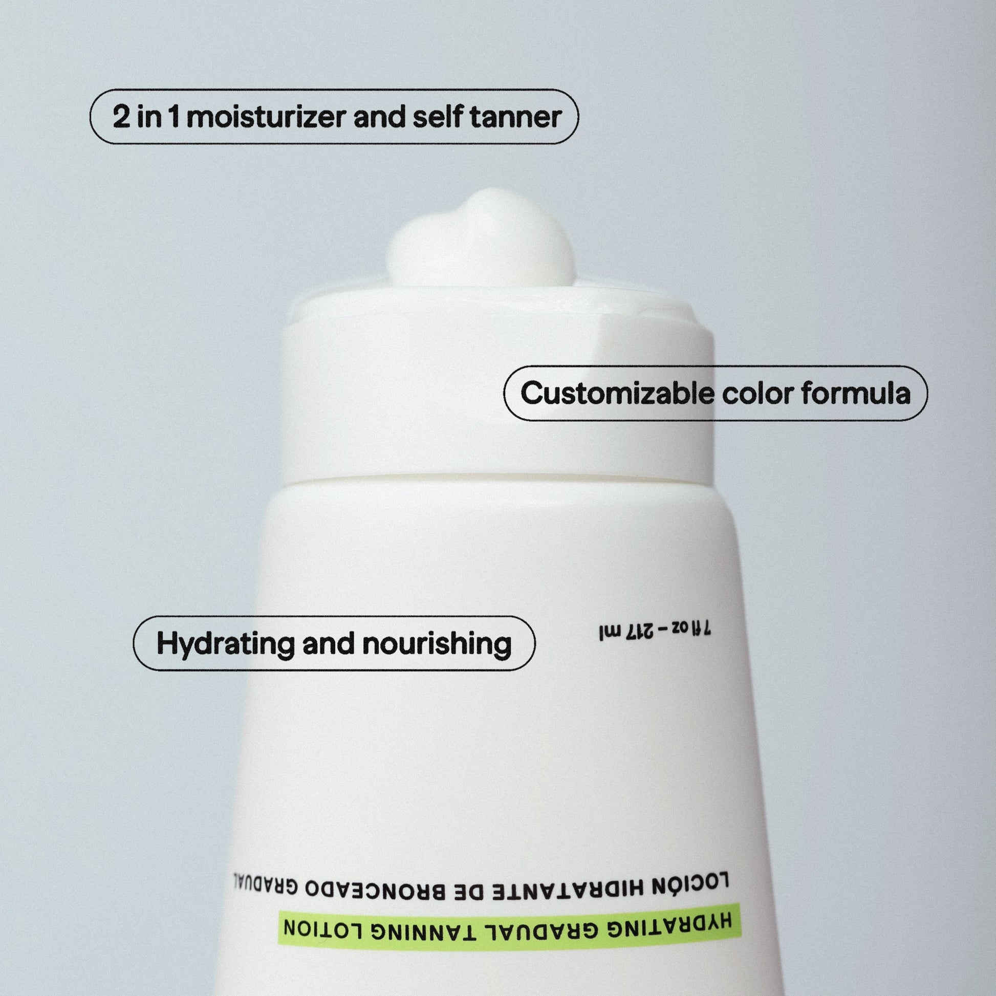 Gradual Bronzer: 2 en 1 hidratante + bronceador. Logra un bronceado con nuestra crema facial y corporal que nutrirá tu piel y te permitirá desarrollar un bronceado gradual perfecto. Totalmente personalizable.